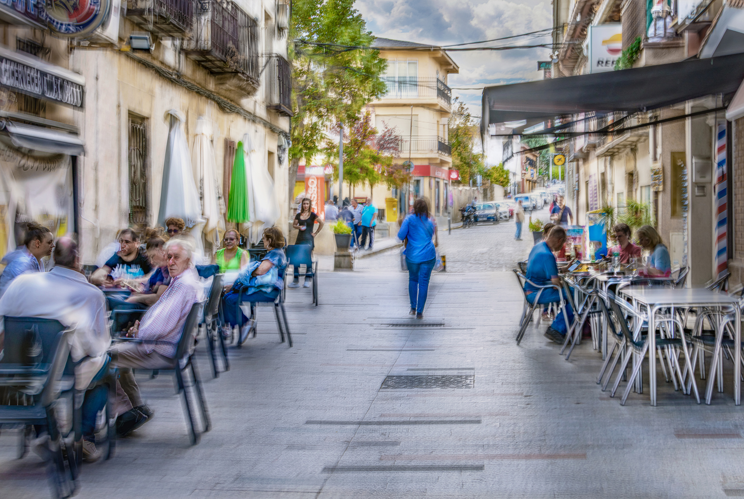 This photograph depicts a typical main street at noon, a time when people are enjoying aperitifs or lunch. It was taken in Buitrago de Lozoya, a town in Spain on the River Lozoya near Madrid, which is known for its well-preserved Moorish walls.